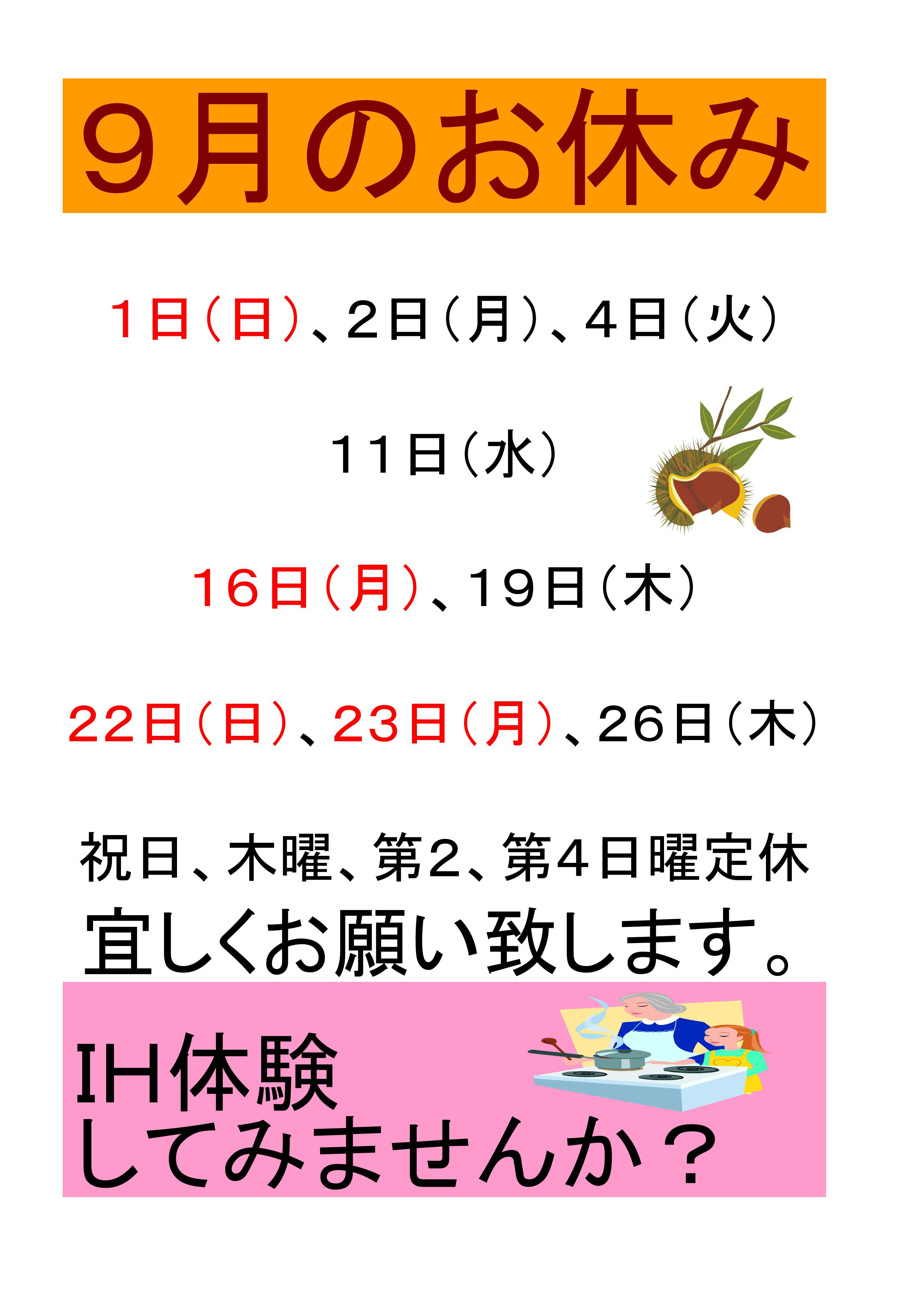 大変おそくなりましたが、展示館のお休み日です。 この日以外はいつでも居りますので、どうぞいらして下さい。 IH体験もしていただけます。 あらかじめご連絡頂きましたら、食材もご用意致します。 費用は要りません。 無料で体験いただけます。 連絡先 多摩市唐木田 1−15−10 フリーダイヤル 0120−05−8210 です。 担当 アリジ です。 よろしくお願い致します。 |