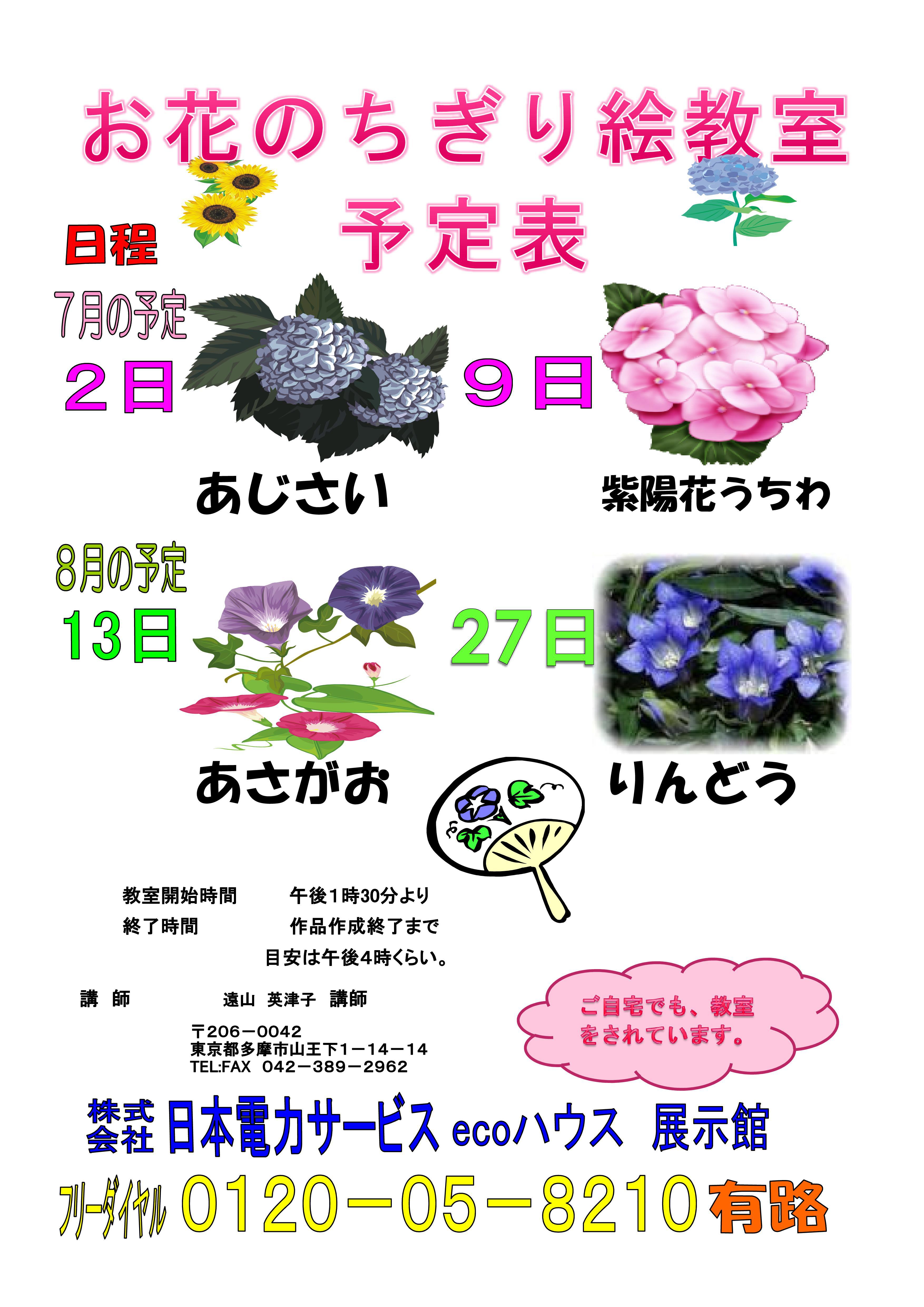 いつまでも梅雨の抜けない、すっきりしない日が続いていますが、いかがお過ごしでしょうか? もし、退屈な時間がありましたら、いらっしゃいませんか? 体験無料でやらせていただいております。 ぜひ、体験にいらして下さい。お待ちしております。 材料の関係もありますので、あらかじめお電話頂きたいと思いますので、よろしくお願い致します。 フリーダイヤル 0120−05−8210 |
